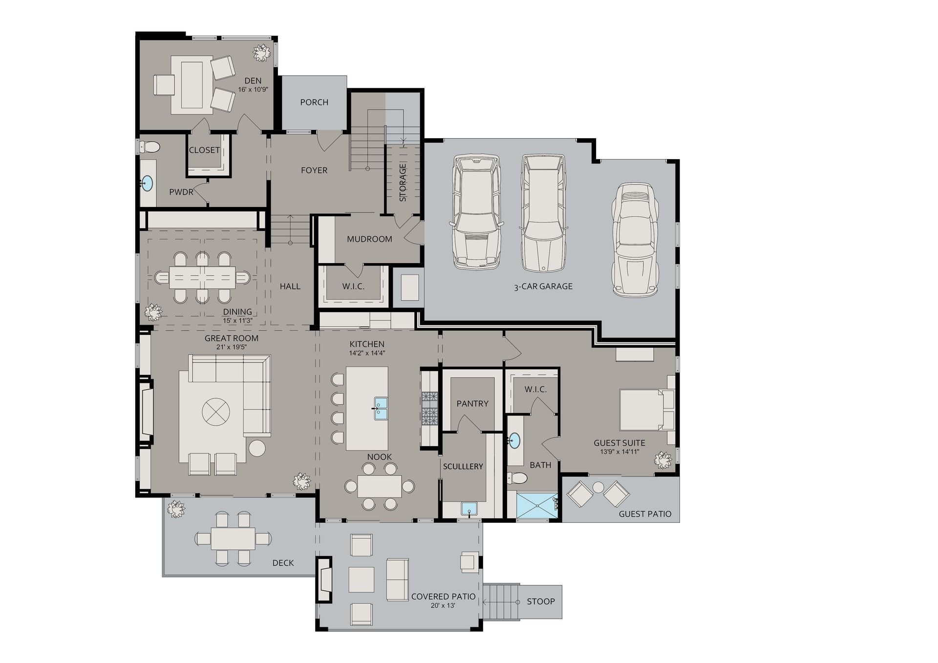 • 12’ high ceiling in the great room, dining room, guest suite and hall