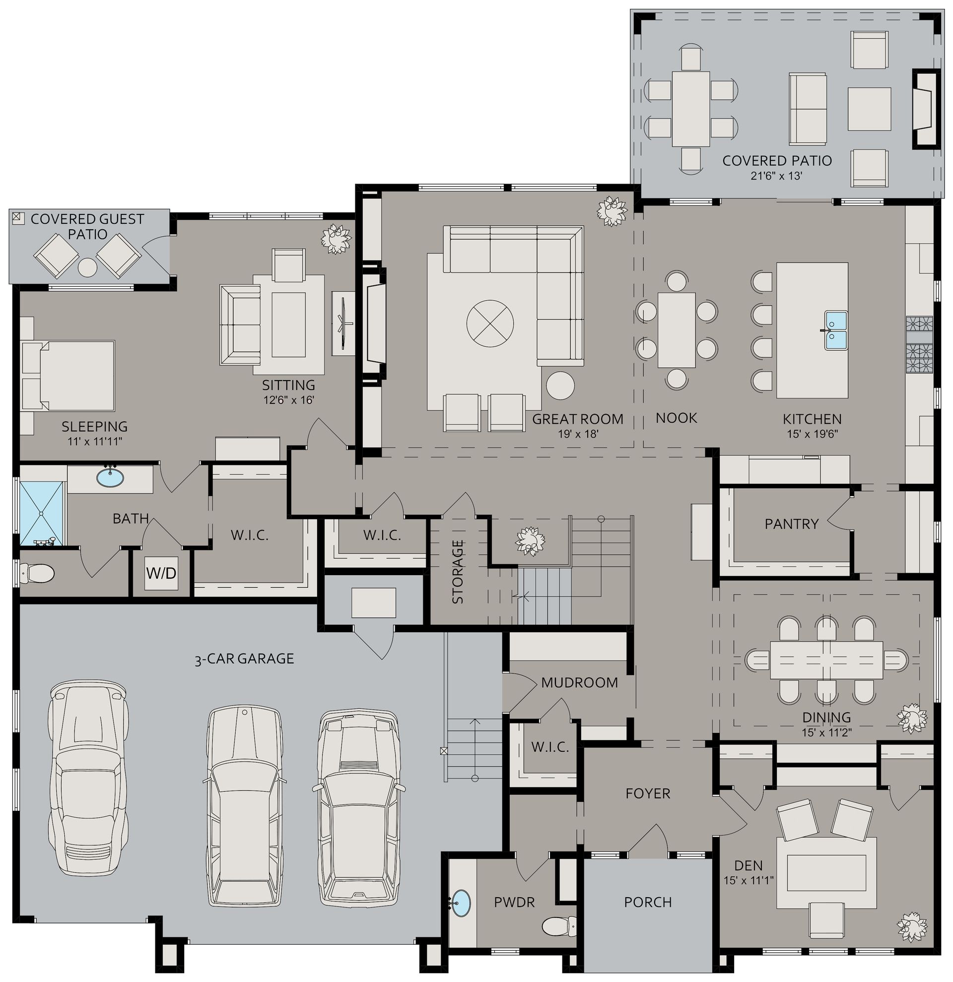Step into this elegant modern home by Everton Homes, featuring an open and airy floorplan with a two-story ceiling height in the Great Room. The chef's kitchen boasts a walk-in pantry, perfect for culinary enthusiasts. On the main floor, you'll also find a versatile den/office room and spacious guest suite adjacent to a dedicated covered patio.