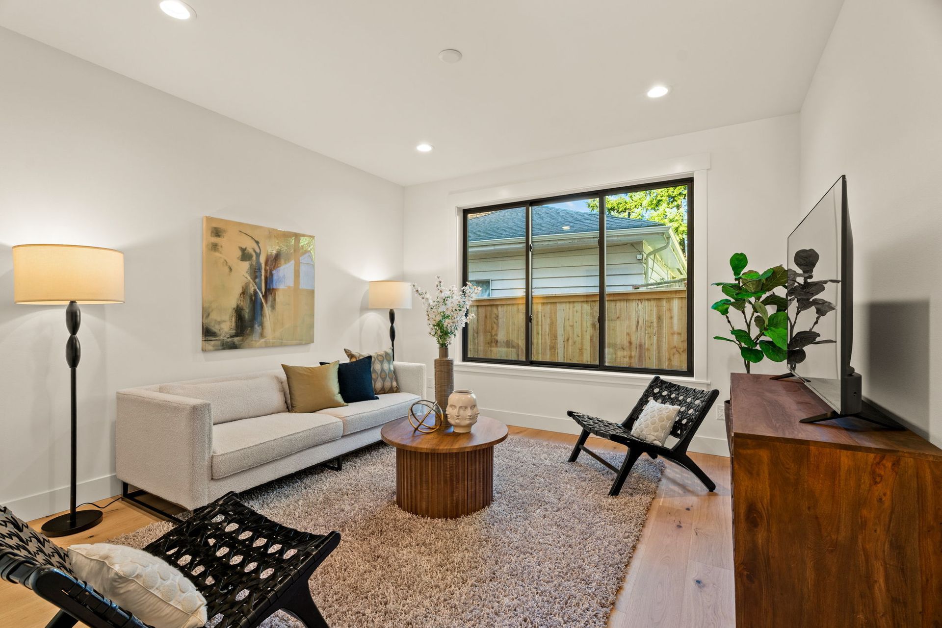 Outdoors, a spacious covered patio invites year-round enjoyment, featuring sitting and dining areas, TV pre-wire above the linear fireplace, outdoor heaters, and a BBQ stub. The fully fenced backyard is equipped with Wi-Fi-enabled irrigation, landscape lighting, and security cameras, providing a seamless blend of comfort, style, and peace of mind. A three-car garage with EV charging outlets completes this thoughtfully curated residence.