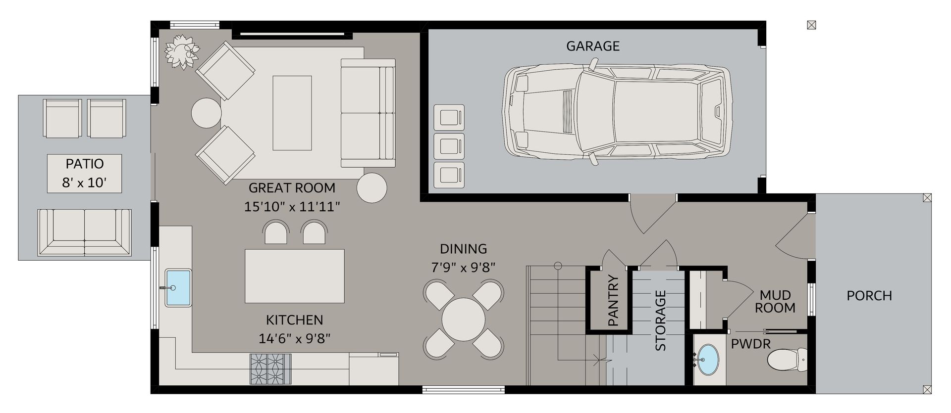 An open-concept main level flows effortlessly to the covered patio. The attached garage and extra storage complete the home’s practical design.